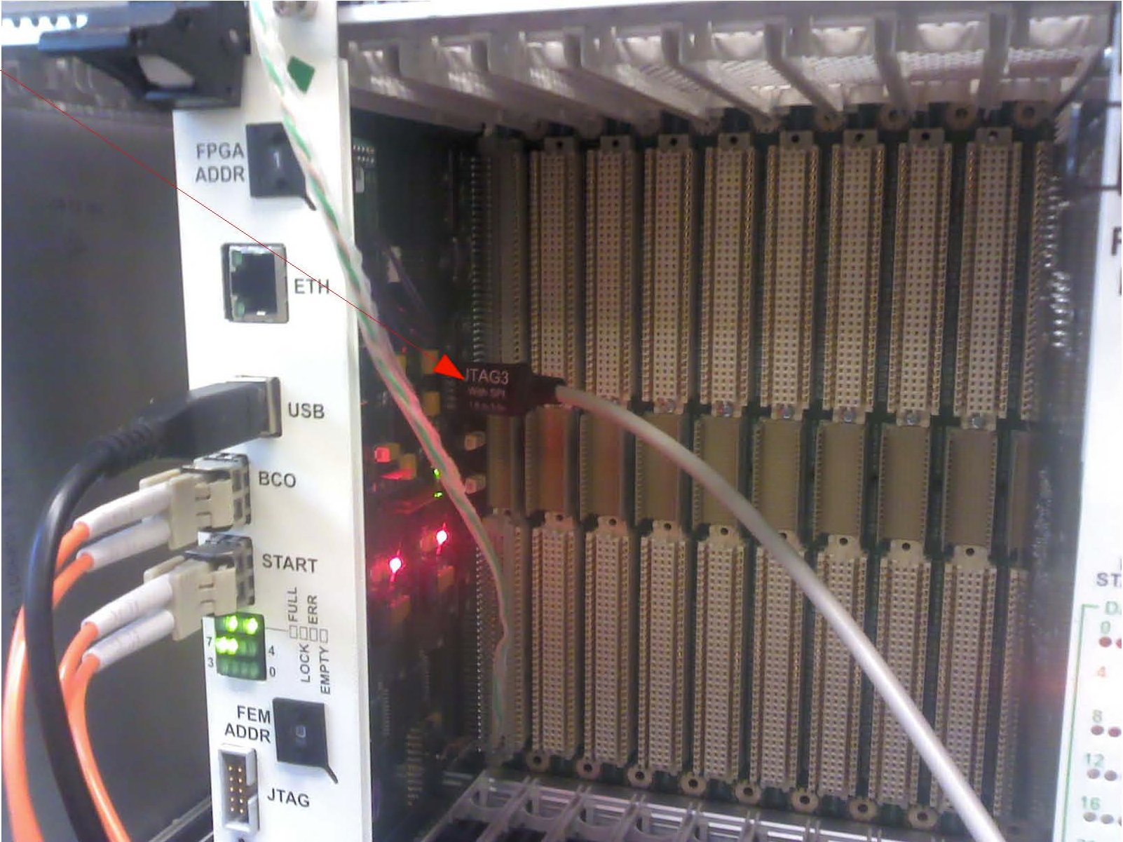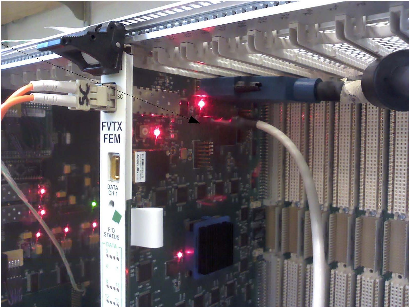 FEM-IB connector is on upper back side of board. Labels on the connector should face towards the front of the VME crate. |